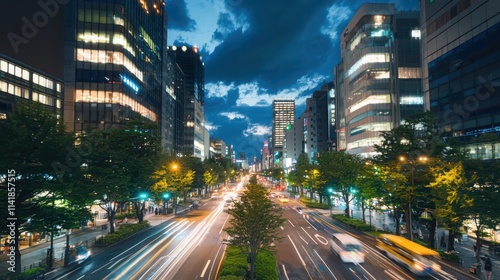 © Nakorn, Fototapeta premium Dynamic nighttime traffic flow in vibrant city streets urban area photography cityscape aerial view motion