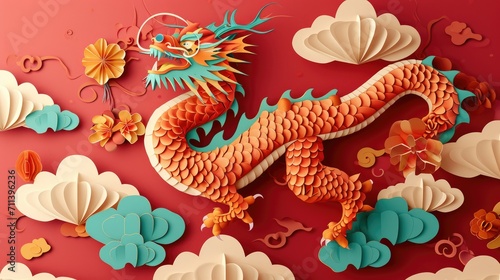 © artestdrawing, Naklejka premium Dynamic paper-cut design chinese zodiac dragon with clouds and sea in the background, layered paper craft chinese dragon for chinese new year celebration