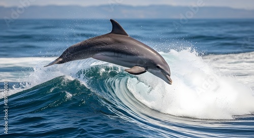 Fototapeta premium Dynamic photograph captures a sleek bottlenose dolphin gracefully leaping...
