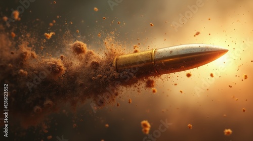 Naklejka premium Dynamic Representation of a Bullet in Motion with Explosive Background and Dust Particles