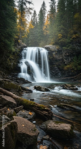 © Patama, Fototapeta premium Dynamic river cascades over jagged rocks, creating a powerful, mesmerizing waterfall in a serene natural forest landscape ,hydro ,nature ,forest