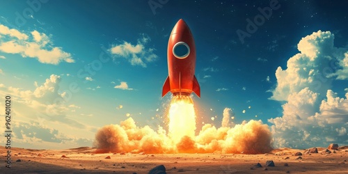 © BG_Illustrations, Obraz premium Dynamic Rocket Launch Against a Cloudy Sky