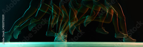 © Lustre Art Group , Naklejka premium Dynamic runner motion trail with multicolor neon shift. Concept of speed analytics, athletic technique studies, performance tracking, and modern sports-science visuals full of kinetic energy. Banner