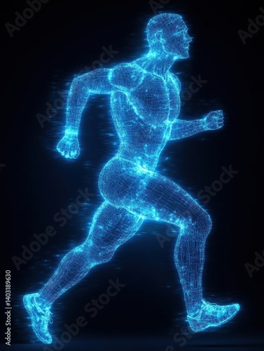 © Anat art, Fototapeta premium Dynamic runner silhouette showcasing muscular structure in glowing digital wireframe mesh frozen in motion