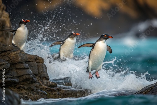Fototapeta premium Dynamic scene of Rockhopper Penguins leaping from the sea onto jagged rocks