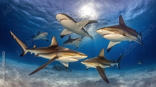 Fototapeta premium Dynamic Sharks in Open Ocean with Dramatic Lighting