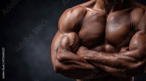 Fototapeta premium Dynamic side chest pose showcasing bicep thickness and chest development in a...