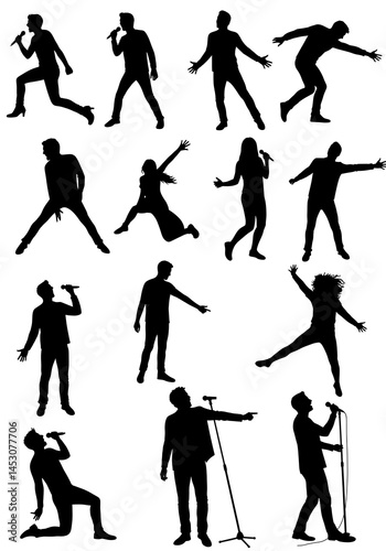 Obraz premium Dynamic Singer Silhouettes: Black & White Stage Energy AI Generated
