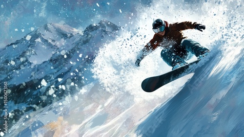 Naklejka premium Dynamic snowboarder carving through fresh powder with mountain backdrop scenery