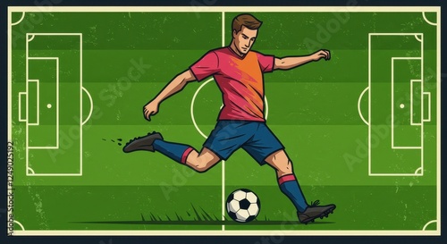 Fototapeta premium Dynamic Soccer Illustration of Player Kicking Ball on Vibrant Green Field -...