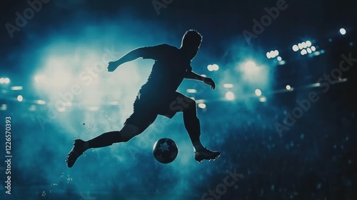 © fourtakig, Naklejka premium Dynamic Soccer Player Leaping to Strike a Ball in a Dramatic Night Scene
