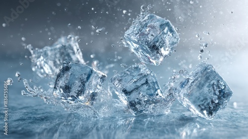 © Taslima, Obraz premium Dynamic splash of ice cubes frozen in mid air amidst water droplets