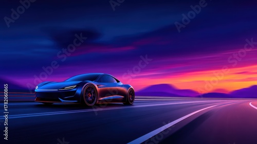 © FoxGrafy, Fototapeta premium Dynamic Sports Car on Highway with Vibrant Sunset Sky