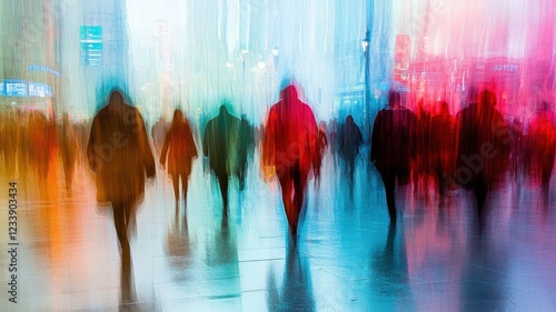 © crazyass, Obraz premium Dynamic street scene of blurry figures walking urban center photography colorful environment artistic perspective
