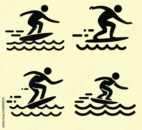 © Yoshan, Obraz premium Dynamic Surfer Silhouettes on Waves, Vector Water Sport Icons Collection