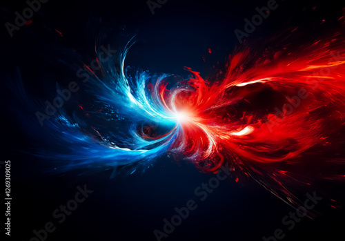 © YiuCheung, Obraz premium Dynamic swirling blue and red light create an abstract energy explosion. Cool and warm colors meet in a vibrant, fiery display on a dark background.