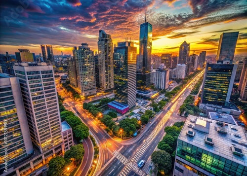Obraz premium Dynamic Urban Landscape of a Busy City with Skyscrapers, Traffic, and Vibrant...