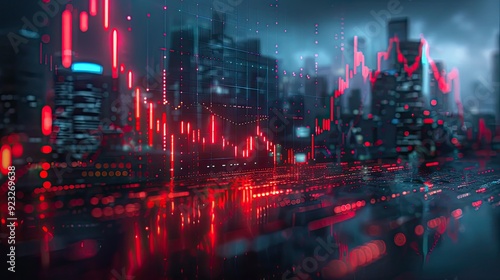 Fototapeta premium Dynamic urban scene with striking red graphs and digital elements, showcasing the pulse of the financial market.