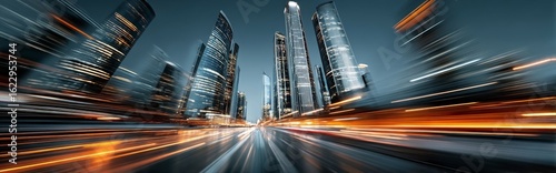Obraz premium Dynamic urban skyline at night with illuminated skyscrapers and traffic