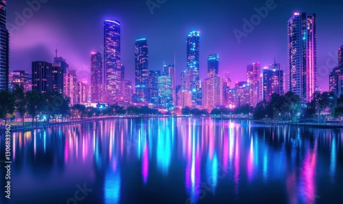 Fototapeta premium Dynamic urban skyline glowing with vibrant neon blue and purple lights reflected on a calm river creating a futuristic cityscape .