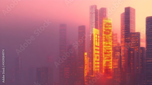 © HiSea, Fototapeta premium Dynamic urban sunrise cityscape digital artwork futuristic environment aerial view innovation