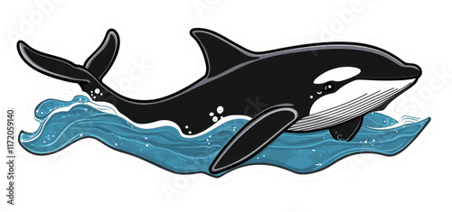 Fototapeta premium dynamic vector illustration of killer whale swimming through stylized ocean waves, capturing majestic and powerful essence of marine life