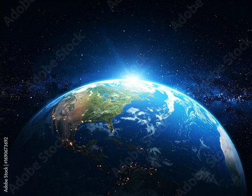 Obraz premium Dynamic view of Earth from space, sunrise illuminating America, city lights.