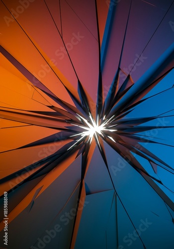 Obraz premium Dynamic visualization of fractured geometry, featuring sharp, disjointed forms and intricate separation on a colorful background, futuristic, edge, fragmented
