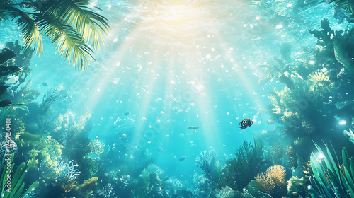 Fototapeta premium Dynamic water splash, bubbles, ripples, underwater light rays and tranquil ocean views