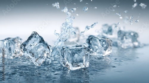 Obraz premium Dynamic Water Splash with Ice Cubes on a Light Gradient Background