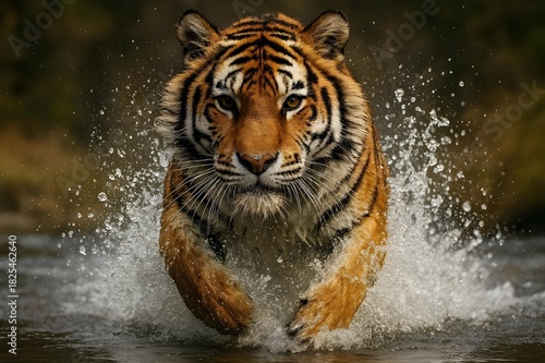 Naklejka premium Dynamic wildlife photo of tiger running through water with splashes and...