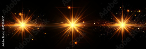 © FATNA, Naklejka premium Dynamic yellow Celestial Explosion set. Black Background with Glowing golden Sunburst, Digital Lens Flare, and Color-Adjusted Light Rays