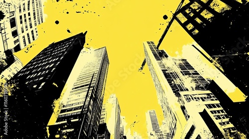 Naklejka premium Dynamic yellow urban street art design with a grunge construction warning theme, combining bold industrial elements, abstract shapes, and vibrant city-inspired creativity for modern graphic concepts