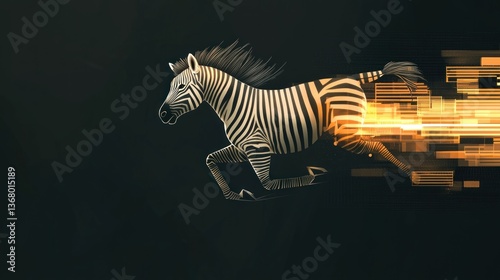 Fototapeta premium Dynamic zebra running through abstract digital landscape urban environment...