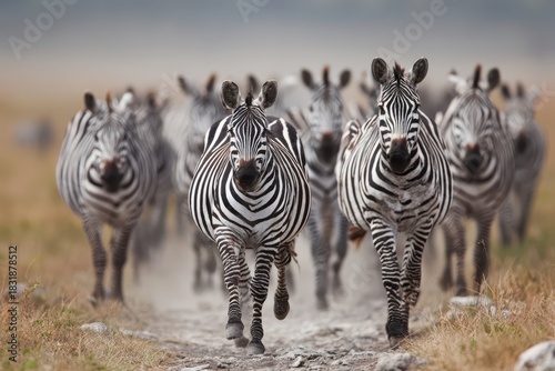 © Olena, Obraz premium Dynamic Zebras on the Move: A Colorful Herd Crossing the African Plain