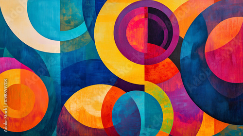 © Sawyer0, Obraz premium Dynamiczna mieszanka jaskrawych kół i płynnych, skręcających się linii, emanująca energią i harmonią w bogatej palecie kolorów.
