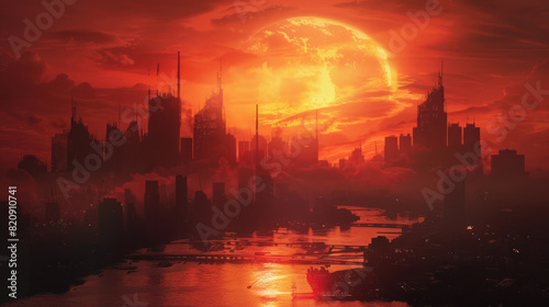 © Santy Hong, Obraz premium Dystopian city skyline silhouetted against a fiery sunset.