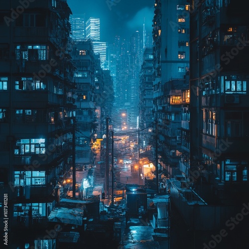 Obraz premium Dystopian city with crumbling slums contrasting a futuristic wealthy skyline,...