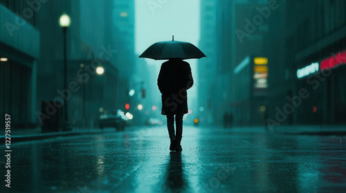 © Gun, Obraz premium Dystopian Cityscape with Neon Lights Reflecting off Rainy Streets at Night