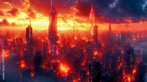 © Plumeria, Fototapeta premium Dystopian Future: Abstract Cyberpunk Cityscape with Glitching Holograms and Chaotic Energy
