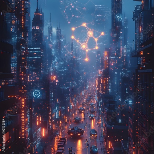 Obraz premium Dystopian futuristic cityscape shrouded in a haze of holographic data and molecular structures projected onto the skyscrapers with neon lit streets bustling with hover vehicles and pedestrians