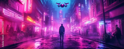 © Kankamol Tama, Obraz premium Dystopian urban decay, neon-lit streets, crumbling high-tech buildings, malfunctioning drones