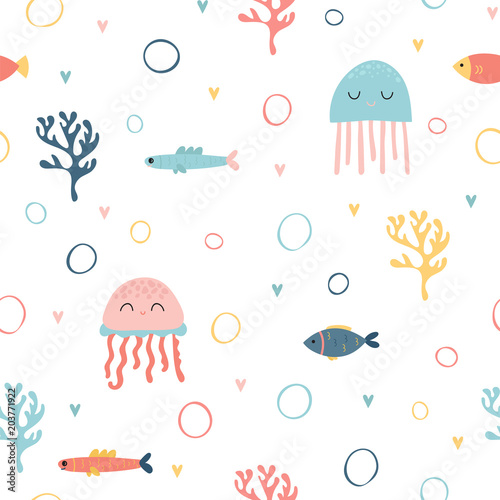 © Helen Sko, Naklejka premium Dziecinna wzór z słodkie ręcznie rysowane ryby i galaretki w stylu Bazgroły. Modne tło przedszkola. Dzieci tekstura tkaniny