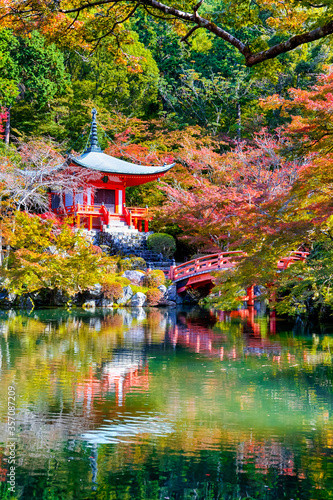 © danmorgan12, Naklejka premium Dziedzictwo japońskie. Spokojna słynna świątynia Daigo-ji podczas sezonu jesiennego pięknych czerwonych klonów w mieście Kioto w Japonii. Z odbiciami stawu w Foregorund.