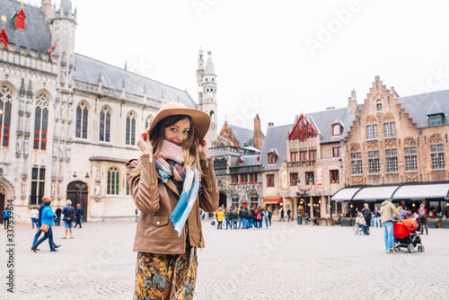 © Aleksei Zakharov, Fototapeta premium dziewczyna patrzy na zabytkowy budynek w Brugii