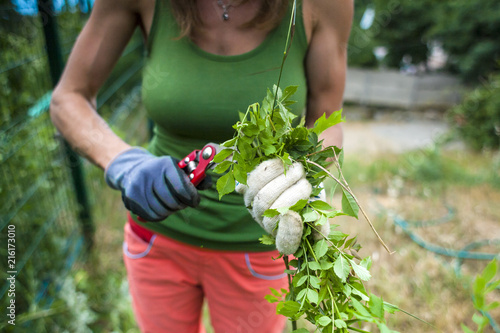 Fototapeta premium Dziewczyna tnie rośliny sekatorem.