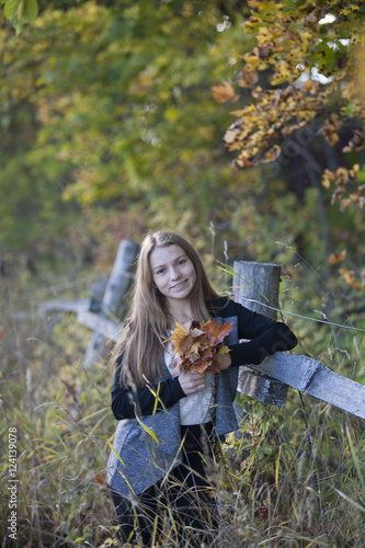 © viktoria_koks, Naklejka premium Dziewczyna z ślicznym uśmiechem w słoneczny jesienny dzień