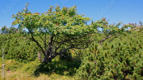 Obraz premium Dziki krzew jarzębiny rosnący pośród kosodrzewiny w dzikich polskich górach,...