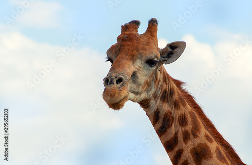 © Yuliia Lakeienko, Naklejka premium Dzikie zwierzęta afrykańskie. Żyrafa Namibii zbliżenie na tle błękitnego nieba