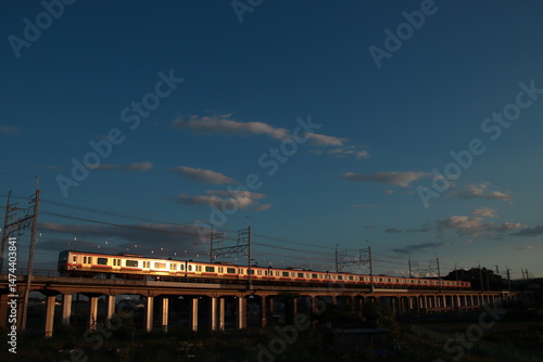 Obraz premium 夕焼け空の下車体を輝かせながら走る武蔵野線E231系電車_2023/6/17撮影